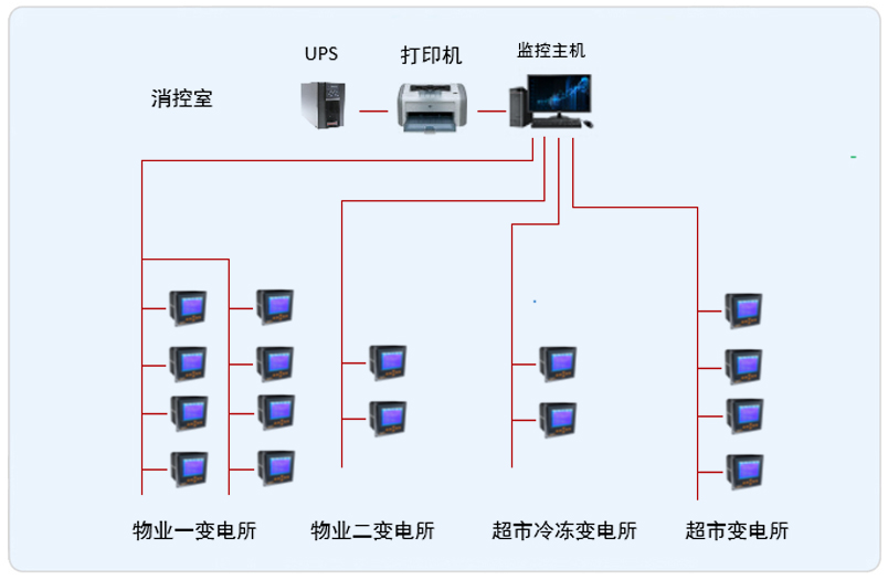 系統(tǒng)采用Acrel-2000型電力監(jiān)控系統(tǒng),整個(gè)系統(tǒng)采用網(wǎng)絡(luò)分布式結(jié)構(gòu),監(jiān)控主機(jī)位于消防監(jiān)控室中,其他4個(gè)配電室分別位于地下一層。該項(xiàng)目實(shí)現(xiàn)了湖州萬(wàn)達(dá)4個(gè)10kV變電所的智能管理。所有監(jiān)控設(shè)備均通過屏蔽雙絞線至后臺(tái)監(jiān)控主機(jī),從而實(shí)現(xiàn)遠(yuǎn)程監(jiān)控。