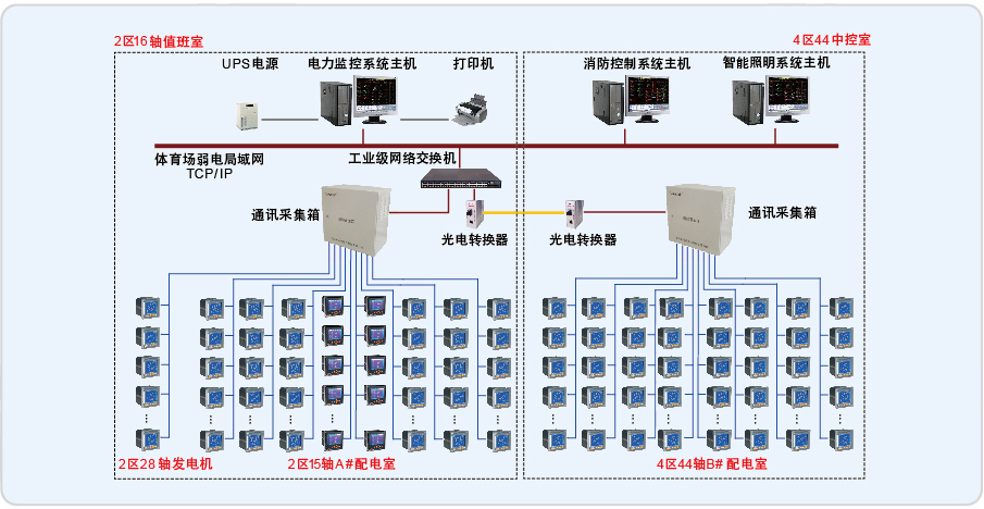 體育場變配電系統60kV以上部分由贊方提供,低壓系統主要變電設備為4臺1600kW干式變壓器和一臺1600kW應急柴油發電機,分別位于2區15軸、2區28軸和4區44軸配電室的內,共27臺低壓配電柜,116個配電回路。本電力監控系統為三層結構,現場設備層由安裝在低壓配電柜上的多功能儀表組成,經由9根RS485總線上傳數據。通訊管理層由安裝在15軸監控室和44軸B#配電室通訊機柜內的通訊服務器、光電轉換器和工業以太網交換機等設備組成,其功能是連接現場設備層和站控管理層。站控管理層設備(監控主機、UPS電源、顯示器等)均安裝在15軸監控室的通訊采集箱內。