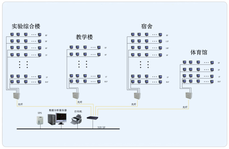 安科瑞Acrel-5000建筑能耗分析管理系統根據上海復旦中學西部校區現場實際情況,整體網絡結構采用屏蔽雙絞線直接接至樓層弱電井的數據采集器然后通過光纖將數據上傳至的監控主機。該系統主要采用分層分布式計算機網絡結構,站控管理層、網絡通訊層和現場設備層。