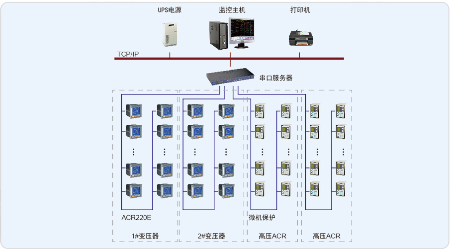 蘇州金閶中學共有一個變配電室,整個配電系統主要有2臺10/0.4 kV配電變壓器和2排高壓進線柜,共計62低壓4個10kV中壓進出線柜,實現了對整個學校的電力供應。本項目電能管理系統主要對變電所內62個進出線回路及10kV配電回路進行管理,實現電力參數實時遙測、電能計量、電能報表等功能。