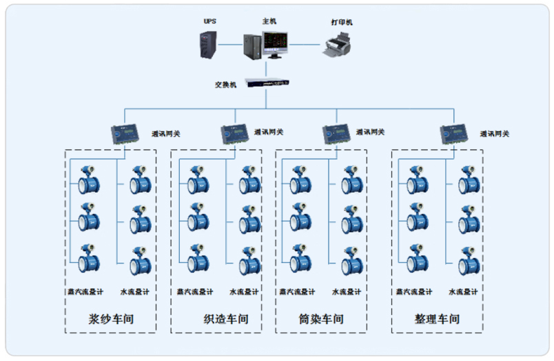 系統(tǒng)采用Acrel-5000型能耗監(jiān)測系統(tǒng),整個系統(tǒng)采用網絡分布式結構,監(jiān)控主機位于現場數據機房中,現場主要監(jiān)測儀表為水、蒸汽的流量計,位于現場4個生產車間內。該項目實現了常州強聲紡織有限公司內能源的智能管理。所有監(jiān)控設備均通過屏蔽雙絞線至各自車間內的通訊管理機,再通過光電轉換器經過光纖將數據傳輸至數據中心,從而實現遠程監(jiān)控。