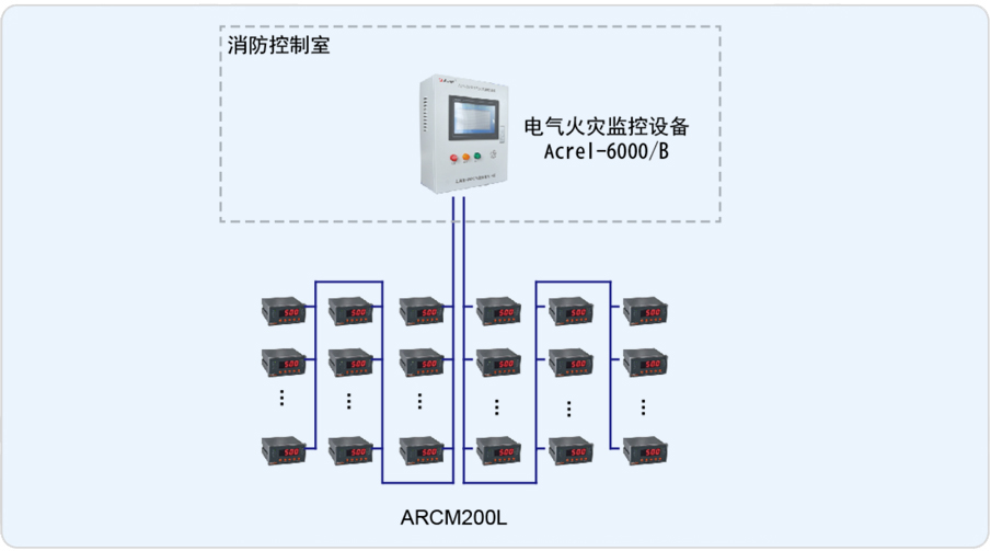 安科瑞于2014年9月承接了該項目電氣火災監控系統,整套系統由壁掛式電氣火災監控裝置安科瑞Acrel-6000/B、ARCM200L剩余電流式火災探測器組成?,F場低壓配電柜內探測器采用2條485總線接至消控中心的Acrel-6000/B壁掛式電氣火災監控系統,當現場保護線路中的被探測參數超過報警設定值時,發出報警信號、控制信號,指示報警部位并保存報警信息。