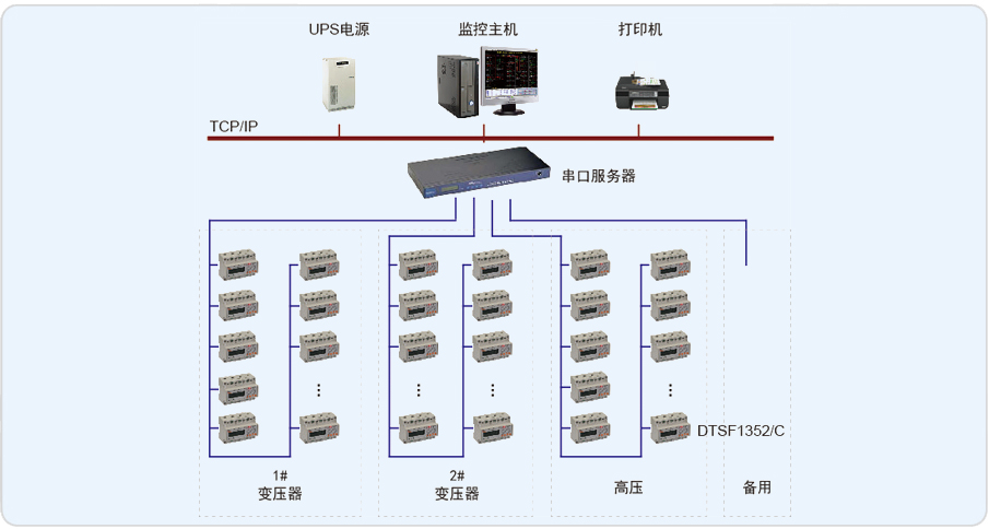 該現(xiàn)場(chǎng)為高壓10kV和0.4KV低壓配電室,共53塊儀表多功能智能儀表( DTSF1352/C),監(jiān)控值班室位于變電所隔壁,通過(guò)組態(tài)軟件Acrel-2000實(shí)現(xiàn)對(duì)現(xiàn)場(chǎng)儀表的實(shí)時(shí)監(jiān)測(cè),并記錄歷史數(shù)據(jù)自動(dòng)生成報(bào)表,以便查詢(xún)。為滿(mǎn)足配電室統(tǒng)一監(jiān)控的要求,配電現(xiàn)場(chǎng)安裝的安科瑞公司網(wǎng)絡(luò)電力儀表通過(guò)屏蔽雙絞線(xiàn)手拉手式相連至后臺(tái)主機(jī)內(nèi)的工業(yè)串口卡,實(shí)現(xiàn)對(duì)現(xiàn)場(chǎng)數(shù)據(jù)的采集,存儲(chǔ),處理,實(shí)時(shí)顯示以及歷史查詢(xún)。