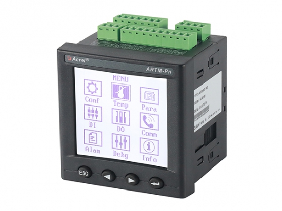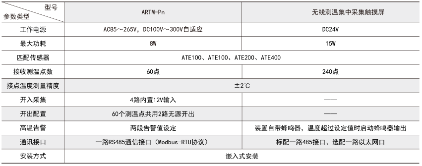 ARTM-Pn無線測溫裝置:ARTM-Pn無線測溫裝置可以單獨安裝在高壓柜、低壓抽屜柜內(nèi),每臺裝置可以接收18個傳感器的數(shù)據(jù),傳感器型號可選配ATE100、ATE200、ATE300。裝置帶有一路48...