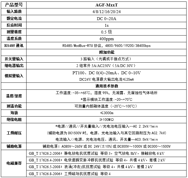 AGF-T穿孔式光伏匯流采集裝置是專門應用于智能光伏匯流箱,用于監測光電池陣列中電池板運行狀態,組串電流測量,匯流箱中防雷器狀態采集、直流斷路器狀態采集、裝置帶有RS485接口可以把測量和采集到的數據...