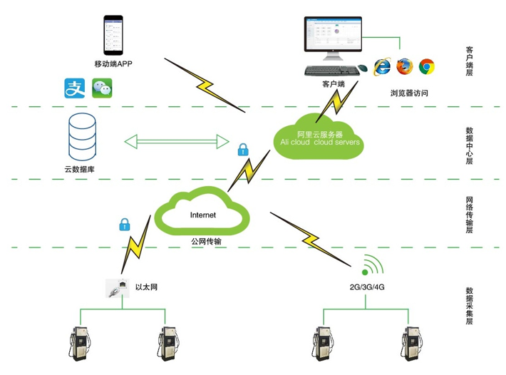 充電樁可選配WIFI模塊或GPRS模塊接入互聯網,配合加密技術和秘鑰分發技術,基于TCP/IP的數據交互協議,與云端進行直連。云平臺包含了充電收費和充電樁運營的所有功能,包括財務管理、變壓器監控和運營分析等功能。