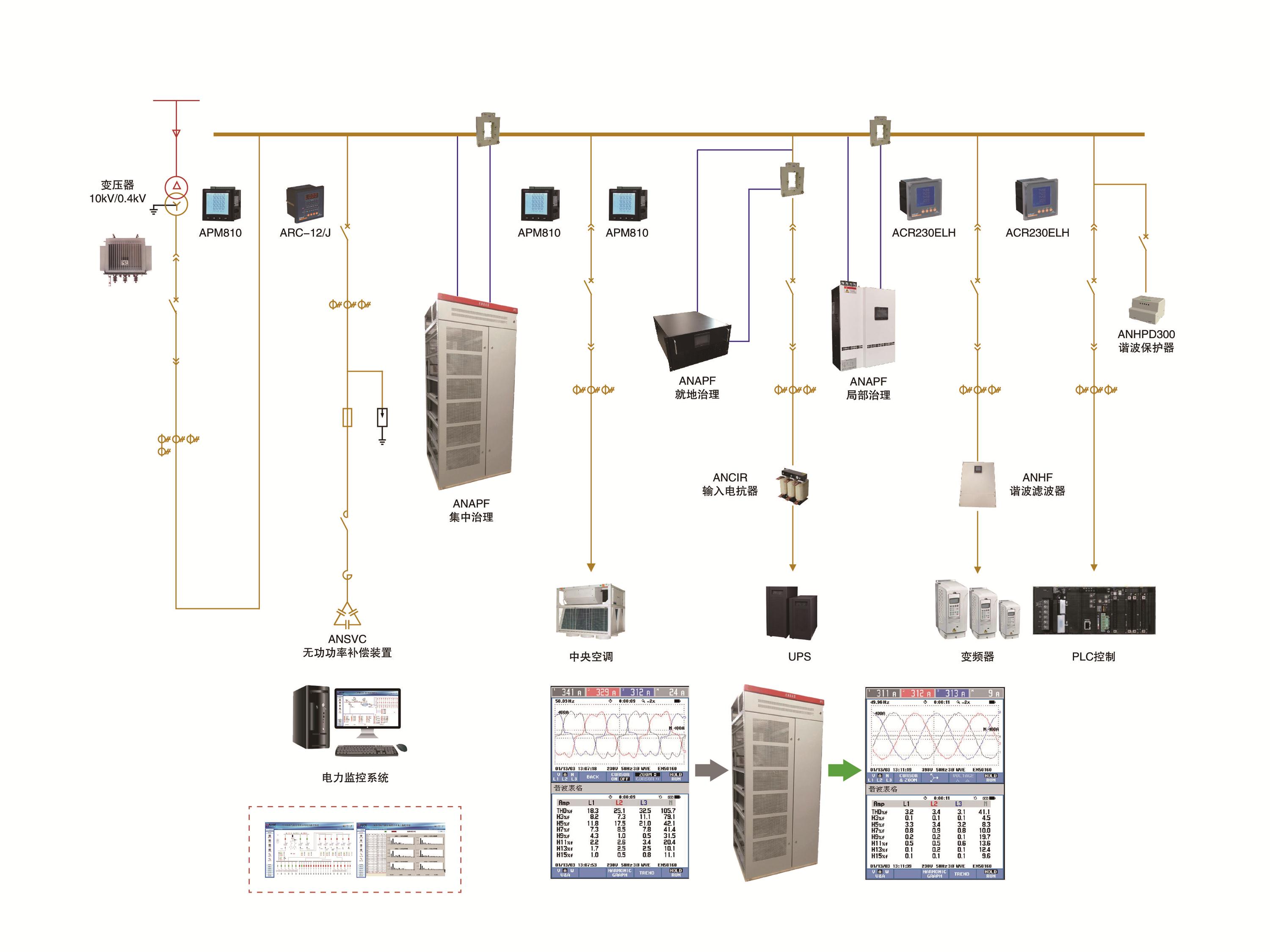 電能質量分析與治理系統主要是研究消除供配電系統中的無功補償和諧波治理問題,主要的產品有有源電力濾波器、低壓無功功率補償裝置、靜止無功發生器、混合動態濾波補償裝置、混合動態消諧補償裝置、智慧型動態無功補償裝置、諧波保護器等,適用于新建、改建、擴建和技改項目中工業與民用及公共建筑內電氣設備的無功補償、諧波抑制及綜合治理等,可根據不同行業類型和負載類型的電能質量問題提供合適的設計解決方案,以達到改善供電質量和確保電力系統安全經濟運行的目的。